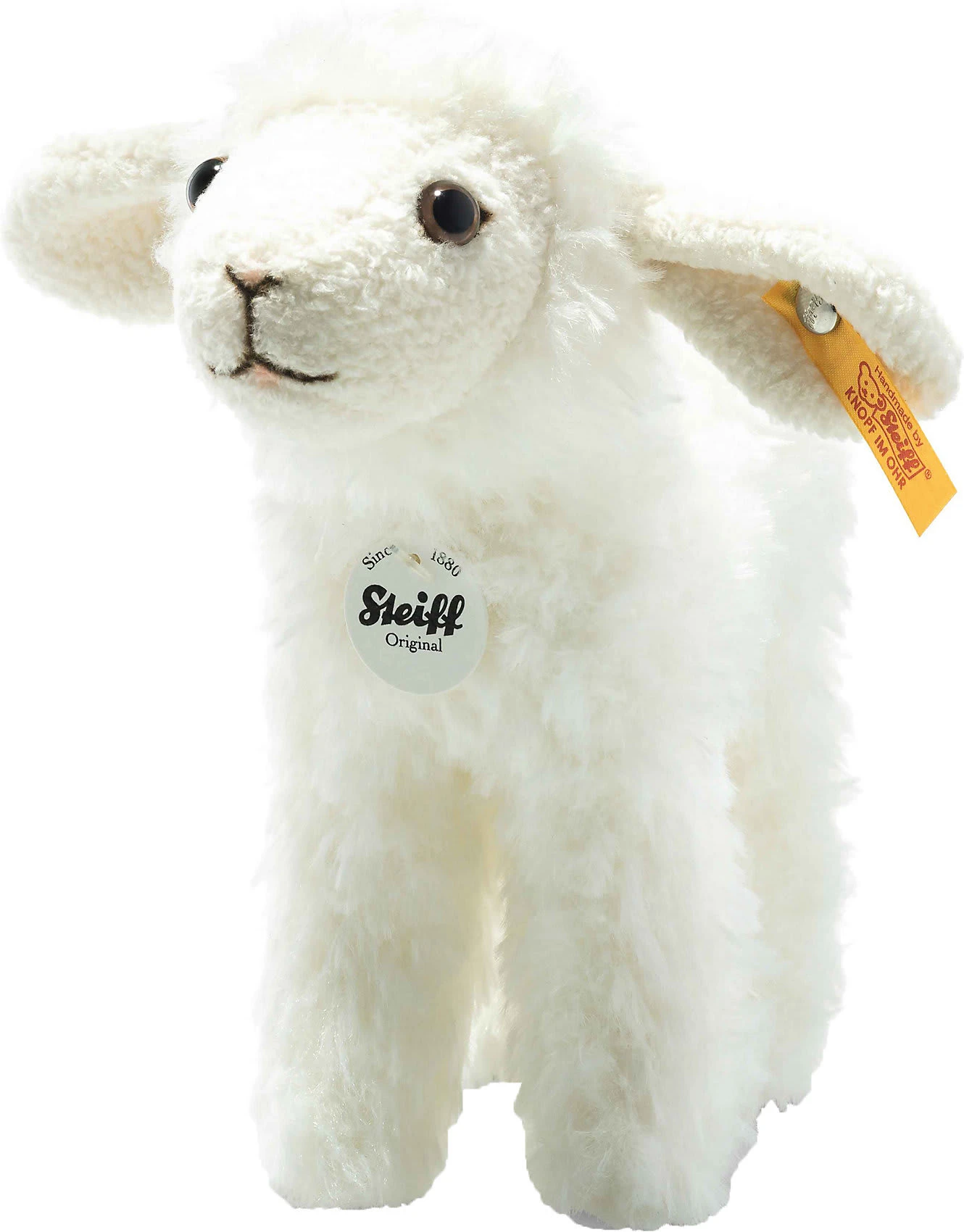 Anni Lamm ist eine wunderbar weiche, treue Gefährtin von klein auf. Ihr Kopf ist leicht angehoben, Mund, Nase und Augenwinkel sind in Schwarz und Rosé mit Airbrush gestaltet. Zum Körper aus dichtem Kuschelplüsch passt das kurzflorige Gesicht, die typischen Lammohren schmiegen sich in kleine Hände. Anni Lamm schaut ein bisschen vorwitzig und stets freundlich. Und vom Streicheln kann sie gar nicht genug bekommen… Das tut gut!