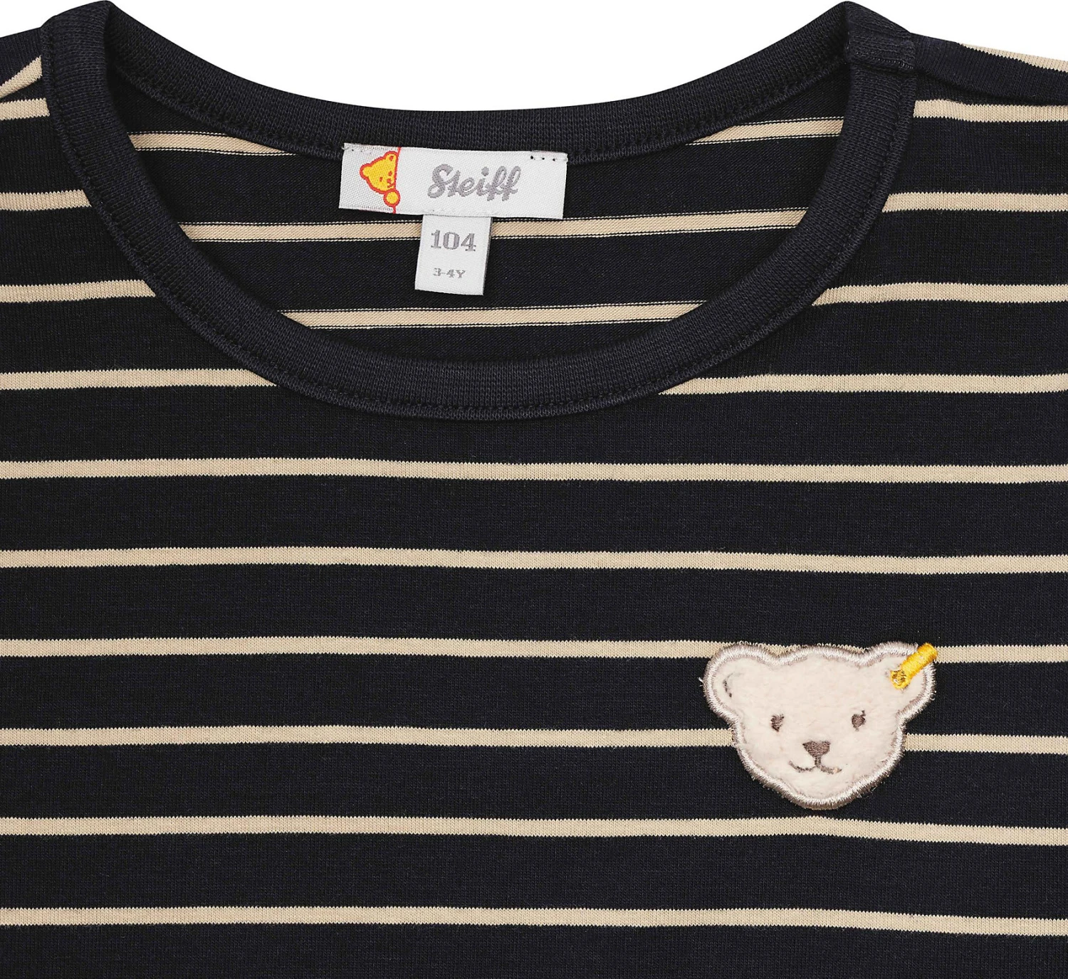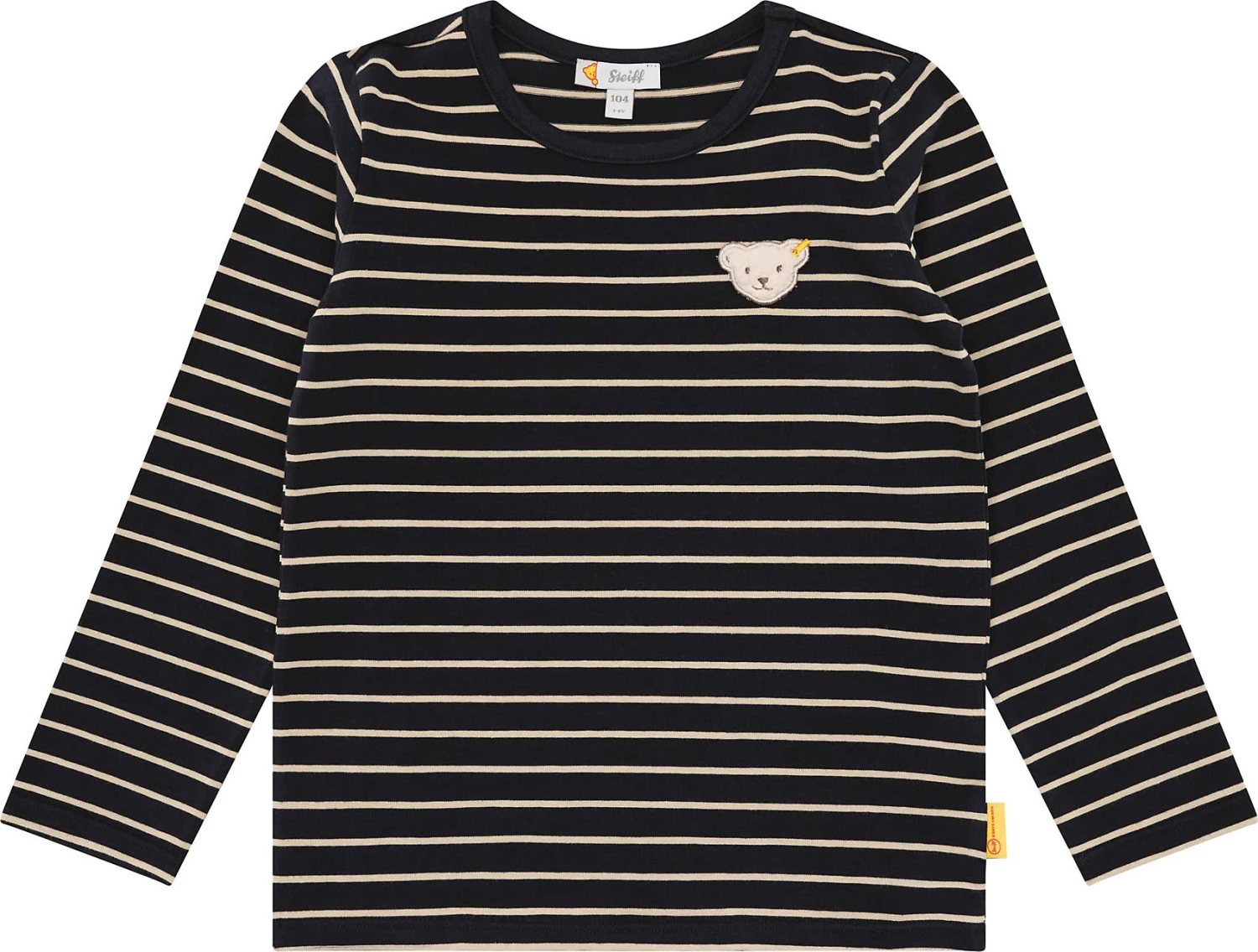 Dieses Langarmshirt ist ein bequemer Begleiter zu den schönsten Ausflügen und Abenteuern. Herrlich weicher Jersey wärmt angenehm und bietet ein perfektes Tragegefühl. Eine lockere Passform schenkt aktiven Jungen Bewegungsfreiheit beim Spielen und Chillen. Streifen in sportlichem Navy verleihen jedem Outfit coolen Retro-Chic und passen auch zu festlichen Kombinationen. Für alle Fälle begleitet ein flauschiges Steiff Teddybärmotiv begleitet Ihren Kleinen durch den Tag. Auf ins Vergnügen!