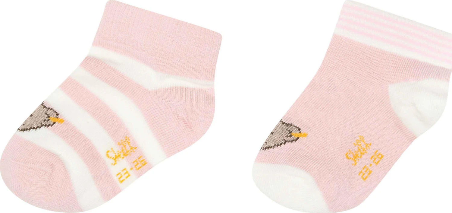 Sneaker-Duo mit Teddymotiv: Die schicken Sneaker-Söckchen in Rosé/Wollweiß und Rosé-Wollweiß gestreift mit zertifizierter Bio-Baumwolle (GOTS) werden eure Sommer-Favoriten! Ihr kurzes, sanftes Bündchen tut euch gut an heißen Tagen. Ihr habt das Teddybärenmotiv perfekt im Blick, unser gelber Schriftzug ist an Bord. Und wie alle Steiff Söckchen sind auch diese superbequem… fein gestrickt und schön weich, mit Ferse und Abnähern an den Zehen. Probiert sie aus – zum Beispiel zur Jeans oder zum Trägerkleid!
