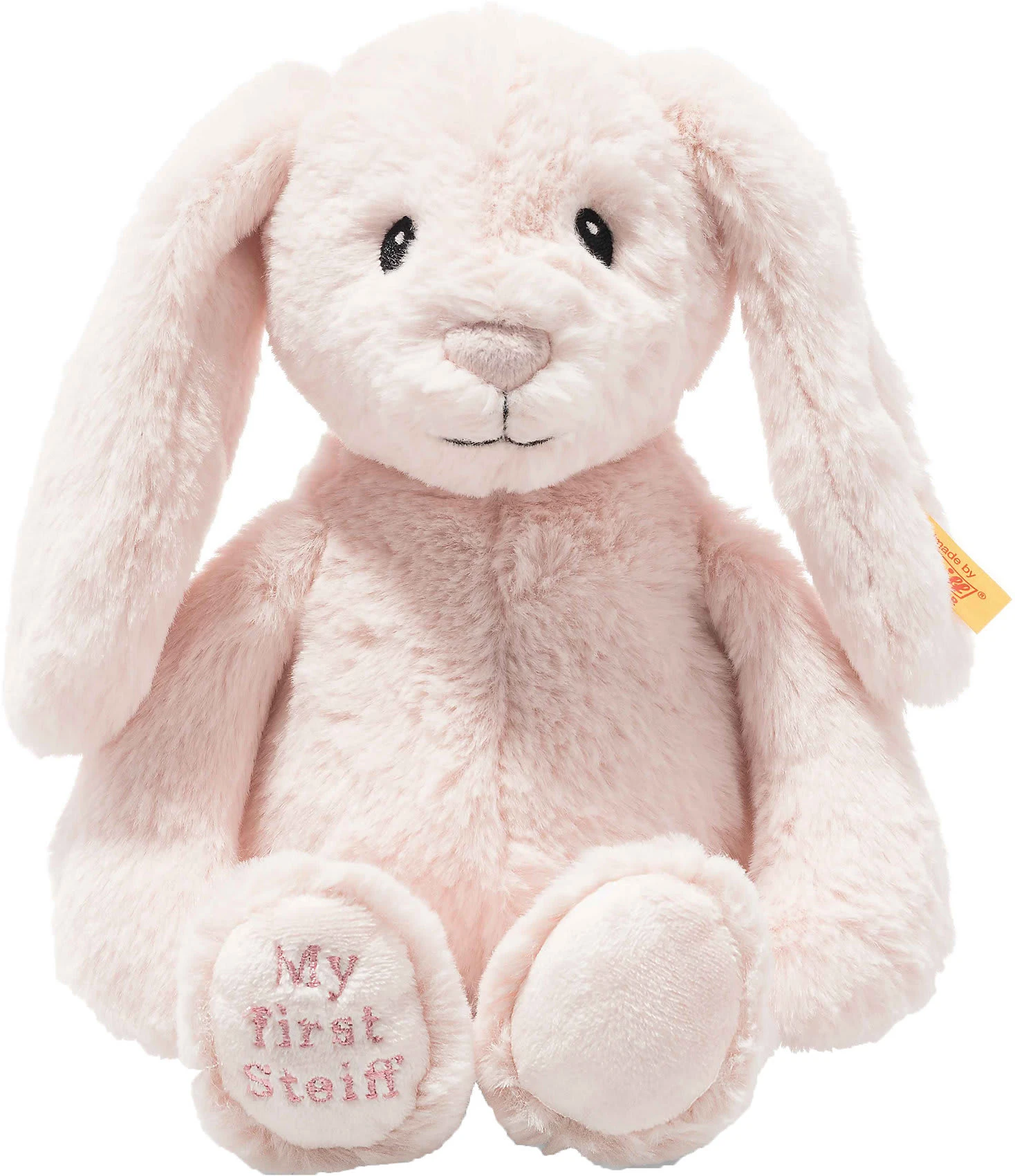 Der Soft Cuddly Friends als „My first Steiff Hase Hoppie“-Edition freut sich auf jeden Neuankömmling in der Familie. Er ist kuschelweich und anschmiegsam. Die Granulatsäckchen in den Armen, Beinen und im Gesäß sorgen nicht nur für Stabilität, sondern fördern auch die Greiffunktionen.